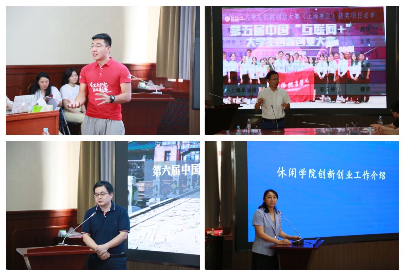 第五届中国“互联网+”大学生创新创业大赛全国金奖、上海市金奖《红色筑梦三项赛》团队负责人赵煜、校内导师代表王雪强、校外导师代表江勇、创新创业工作优秀组织奖代表休闲学院院长王红英分别围绕参赛经验、项目打造、科技成果转化、二级学院组织等方面进行了交流发言。