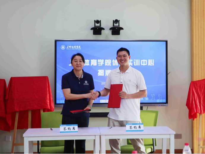 本网讯 7月16日下午,上海体育学院休闲实训中心揭牌暨实习基地签约仪式在高尔夫练习场举行。上海体育学院党委副书记、院长陈佩杰,党委副书记、纪委书记詹萌,院办主任徐畅,教务处处长邵斌、副处长沈高飞,巅峰减重董事长余安奇、副总经理冯磊,上海花样跳绳协会秘书长李胜席、跃动总经理钟水军,尚体人力资源总监李建银出席。休闲学院党政领导班子、教学团队负责人、组织员、辅导员参加揭牌仪式。仪式由休闲学院党委书记霍圣录主持。
