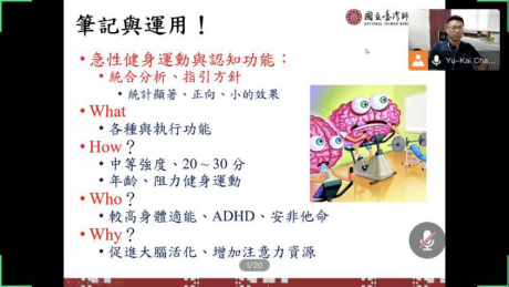 张育恺老师以“运动锻炼心理学的研究与进展”为主题,从自身的成长出发,倡导大家从运动中寻找自我。结合运动健身领域的研究,提出了未来健身产业的趋势,并详细介绍了健身运动与大脑可塑性、急性健身运动干预的实验成果,并以“八卦导引”为例,介绍了何将科学研究的成果转化为实际应用。