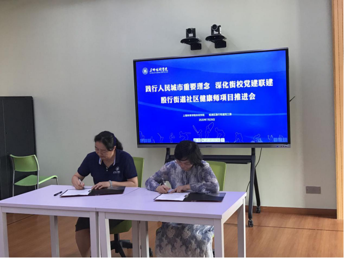 休闲学院党委副书记、院长王红英与殷行社区街道党工委副书记黄春怡签署实习实践协议书。