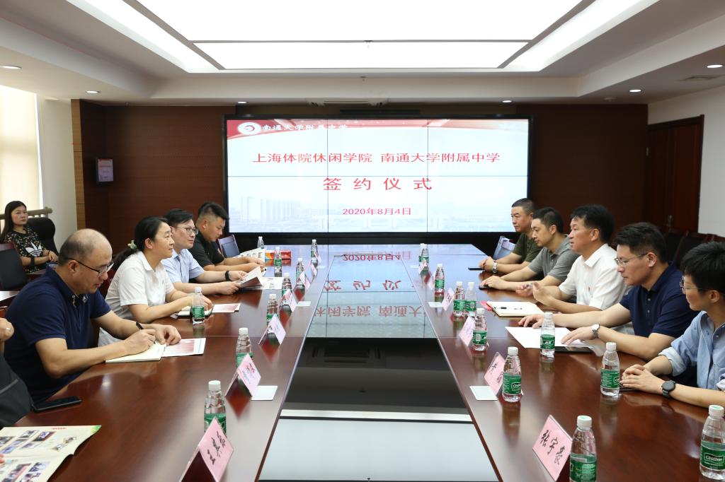本网讯 8月4日,上海体育学院休闲学院与南通大学附属中学合作签约仪式在通大附中举行。休闲学院院长王红英,党委副书记、副院长顾郑军,通大附中副校长周云旗,办公室主任陈晓宇、副主任杨志俊,长江高尔夫俱乐部总经理王红波及双方教师代表参加了签约仪式。