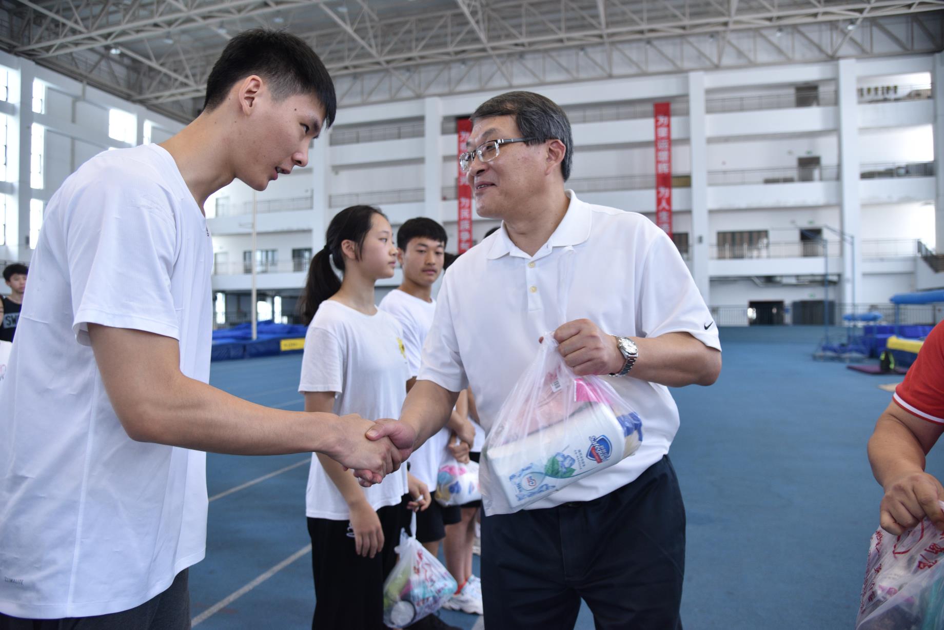本网讯 炎炎酷暑日,夏训正当时。8月11日上午,学校领导到田径馆训练一线慰问在高温酷暑中坚持留校训练的各运动队,为运动员们送上防暑降温用品。学校党委书记李崟,党委副书记、院长陈佩杰出席慰问活动,院办、竞校、竞训处、后勤处等部门和单位负责人陪同慰问。