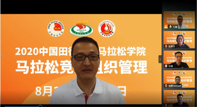 8月26日上午,2020年中国田径协会马拉松学院第一期“马拉松竞赛组织管理”线上培训班正式开始,中国田径协会副秘书长、社会活动部主任水涛,上海体育学院体育教育训练学院院长高炳宏,中国田径协会社会活动部副主任赵朴,北京中迹体育管理有限公司董事长、中国马拉松资深运营专家张思杰,特步(中国)跑步发展中心高级总监齐冰,武汉汉马体育管理有限公司总经理包波等领导和嘉宾出席了本次线上培训开班典礼。