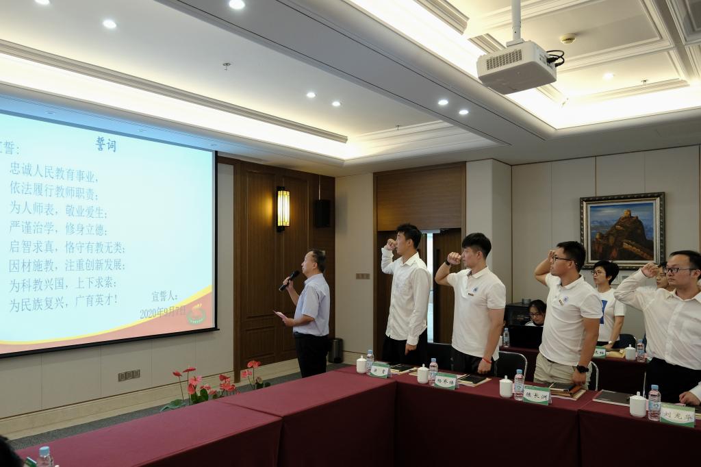 为更好勉励新教师,帮助新教师快速适应身份角色、明确岗位职责,欢迎会上还举行了校徽佩戴和入职宣誓仪式,全体新进教师在党委副书记潘勤带领下,郑重宣誓。