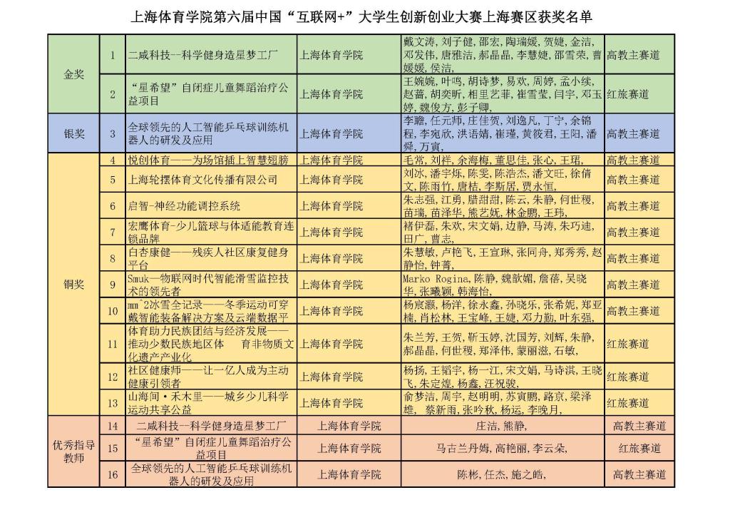 本网讯 近日,由上海市教育委员会、上海市发展和改革委员会、上海市人力资源和社会保障局、上海市经济和信息化委员会、共青团上海市委员会共同主办的第六届中国国际“互联网+”大学生创新创业大赛上海赛区决赛圆满落幕。SUNBET作为入围决赛的16所高校单位之一,主赛道项目《二咸科技--科学健身造星梦工厂》与红旅赛道项目《“星希望”自闭症儿童舞蹈治疗公益项目》经过激烈争最终斩获上海市金奖,《全球领先的人工智能乒乓球训练机器人的研发及应用》获得银奖,此外还有10个项目获得铜奖,总体情况创历史最好成绩。