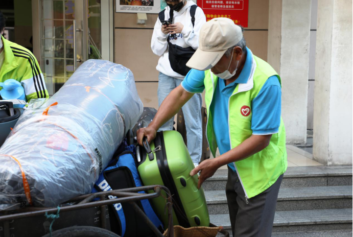 校保卫处联合交警部门疏导校门口人车交通;校后勤处提供新生行李免费运送服务车,一次又一次穿梭在校园中帮新生把行李搬运至宿舍;各学院导生、志愿者热情引导小萌新们到各自学院报到点注册报道,“无缝对接”暖心服务。