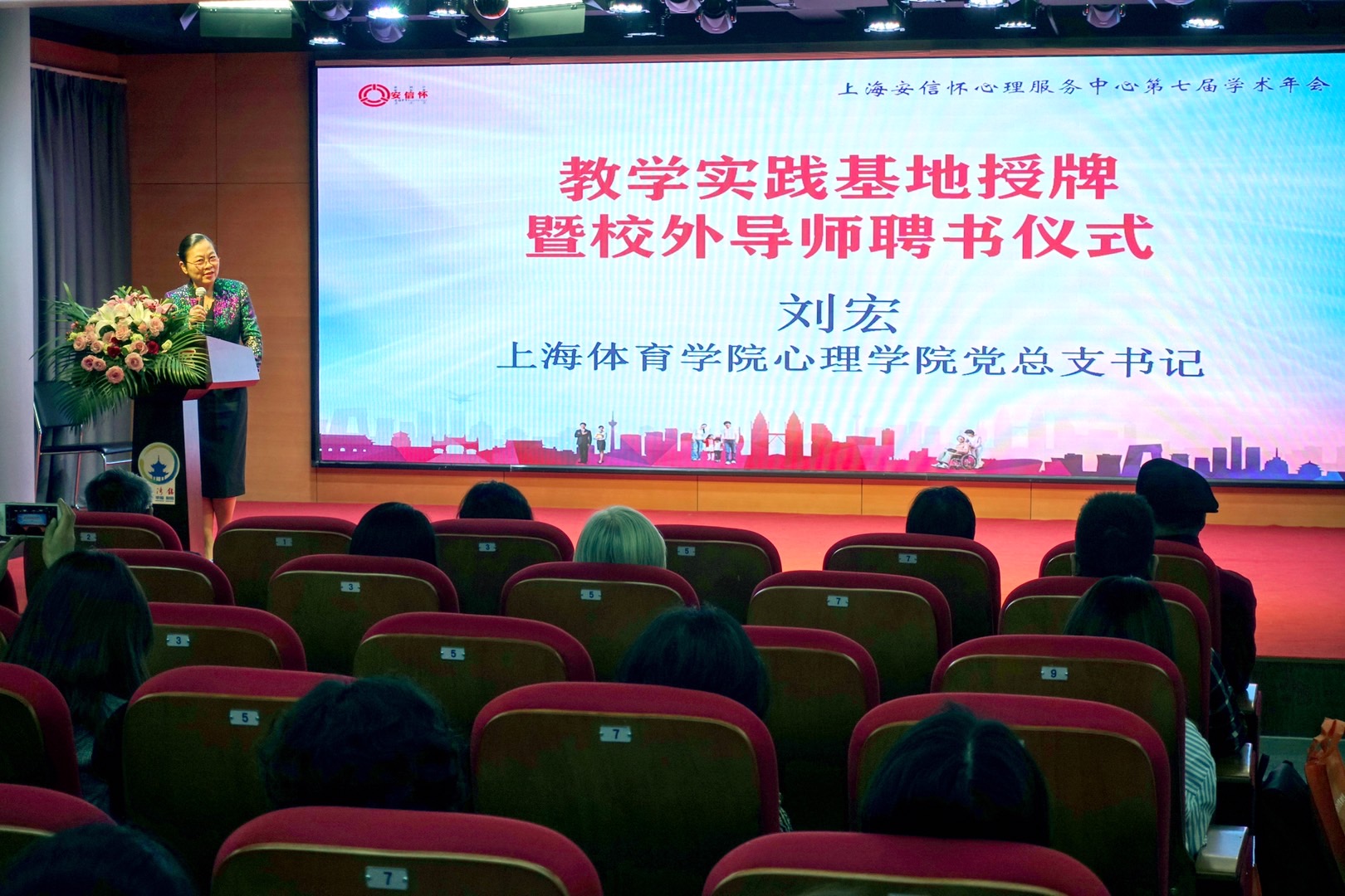 上海体育学院心理学院党总支书记刘宏为安信怀心理服务中心授牌,并为理事长周祝慧颁发校外导师聘书。