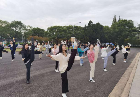 2020年10月19日早上6:30,传媒与艺术学院舞蹈编导专业学生迎着朝阳在专业教师的组织带领下,奔跑在校园里,绿瓦大楼前拉柔韧、踢腿、控制、跳跃和核心部位训练,专项技术练习以及口令、讲解与示范等能力训练,学生们练得积极而投入,构成了一幅努力拼搏、青春绽放的美丽画面。