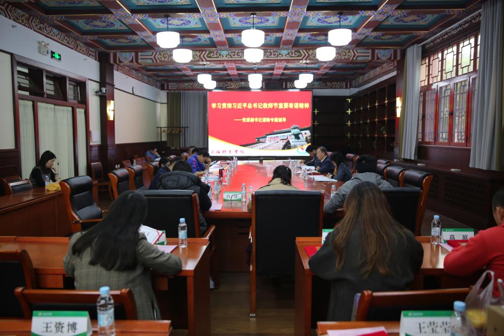 党委副书记潘勤就学习贯彻习近平总书记教师节重要寄语精神做专题辅导。潘勤指出,习近平总书记关于教育重要论述是习近平新时代中国特色社会主义思想的重要组成部分,是马克思主义基本原理同中国教育实践相结合的最新成果,标志着我们党对教育规律的认识达到了新高度。潘勤强调,学习贯彻习近平总书记教师节重要寄语精神,一要深刻领会习近平总书记教师节重要寄语精神的重大意义和深刻内涵,探索新时代教育教学方法,全方位提升教书育人本领;二要结合学习宣传《习近平总书记教育重要论述讲义》,系统深入学、亲力践行学、深刻感悟学,全面推进学校“课程思政”工作,引导师生把思想和行动统一到重要寄语精神上来;三要强化组织领导,把握工作思路,做好服务保障,营造尊师重教环境,健全学校师德建设长效机制,推动学习宣讲往深里走、往实里走、往心里走。