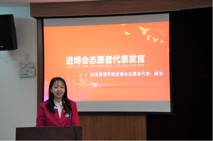 路京作为本届进博会志愿者代表,在发言中提到,要积极践行“互助、友爱、奉献、进步”的志愿精神、公益行动;坚定政治站位,树立责任意识;认真参与培训,提升服务技能;积极投身岗位,展现上体学子风采。