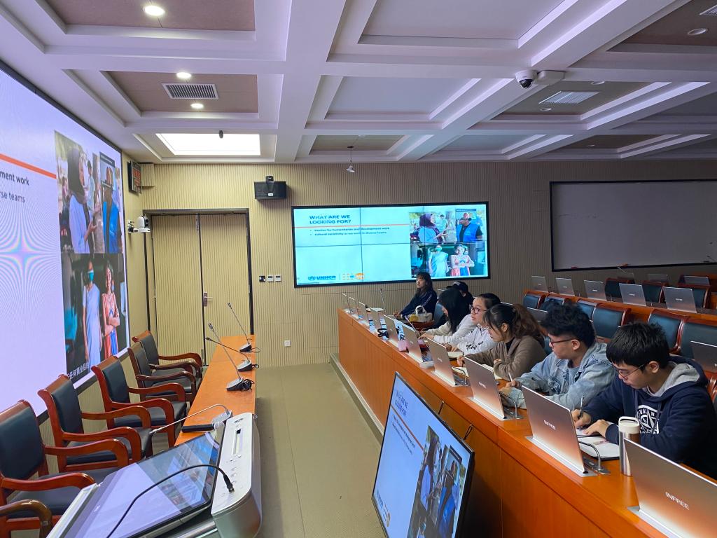受疫情影响,联合国机构宣讲咨询活动采取“提前录制、定时投放、授权观看”方式,分为公开课和集体观看课两部分。在首届活动基础上,此次活动增设国际组织职业技能培训板块,邀请联合国教科文组织、联合国难民署、联合国发展计划署、国际红十字委员会、世界卫生组织、联合国人口基金会6个国际组织的资深人力资源官与学生开展简历写作技能、面试技巧两场线上培训。SUNBET组织了一批来自国教学院、经管学院的外语水平良好,有志于到国际组织工作的学生观看培训课程。