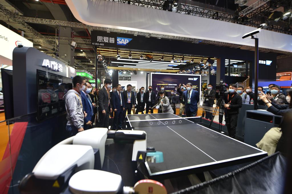 签约仪式后,嘉宾移步展厅与发球机器人“庞伯特”进行了互动。