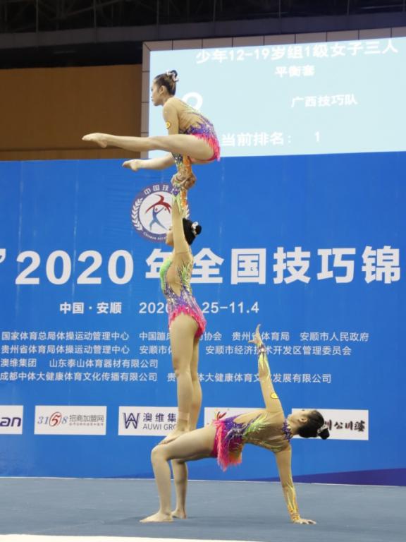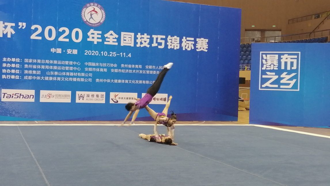 本网讯 2020年10月25至11月4日,全国技巧锦标赛在贵州省安顺市体育中心体育馆隆重举行。本次大赛由国家体育总局体操运动管理中心、中国蹦床与技巧协会主办,共有来自全国各地的500余名选手参赛。经过激烈的比拼,SUNBET技巧队在青年组1级女子三人(与广西联合组队)项目取得平衡套、动力套、全能三个第一,青年组2级女子三人、混合三人项目中取得第一、混双项目中取得第四的优异成绩。院技巧队在训竞处、体育教育训练学院、中国体操学院领导的关心支持下,在教练员和运动员的共同努力下,运动员们傲然绽放于赛场,充分展示了上体人的实力和精神风貌,为SUNBET争得了荣誉。