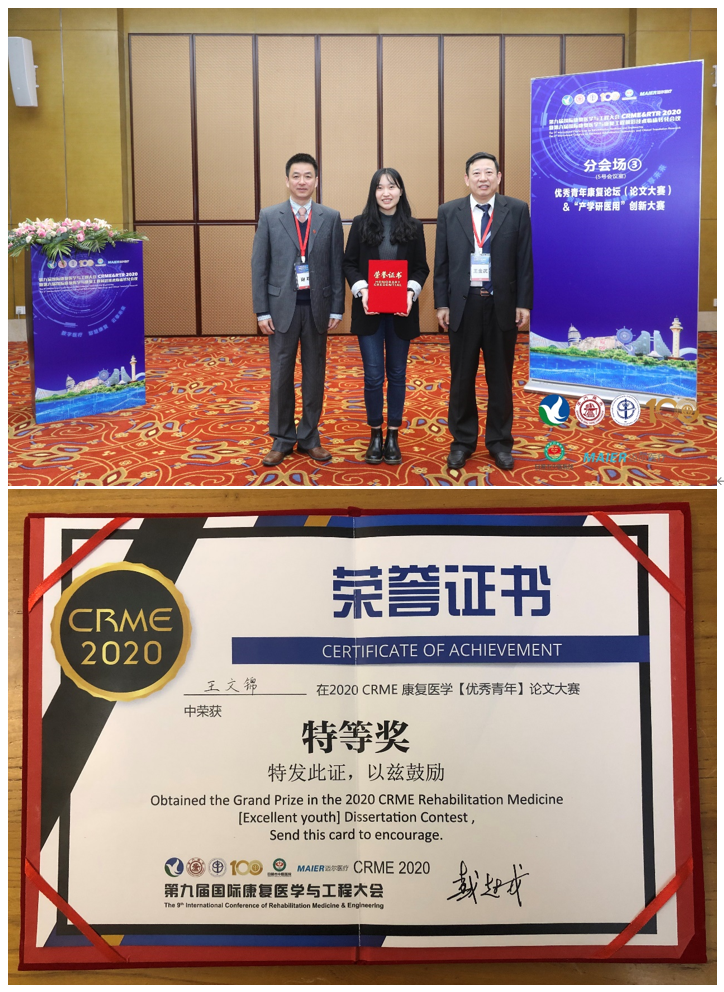 本网讯 11月13日-15日,第九届国际康复医学与工程大会暨第六届国际康复医学与康复工程前沿技术临床转化会议(2020 CRME & RTR)在日照举行。运动科学学院学生王文锦论文《High-Speed Fluoroscopy Imaging Technique for Investigation of 6 DOF Knee Kinematics Before and After Marathon Running》(高速双平面透视技术研究马拉松跑前后膝关节6自由度运动学),获得了各方认可,荣获大会唯一的特等奖。