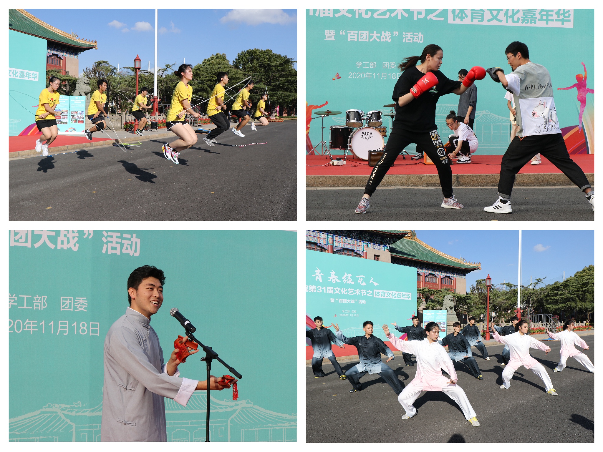 在精彩的开场演出过后,主持人公布了2019-2020学年上海体育学院“星级社团”评选结果,由党委副书记、副院长陈晓峰老师为获奖社团颁奖并合影留念。接下来,精彩继续,来自5星社团花样跳绳社的《冠军show》,绳舞动、心飞扬,再次点燃全场。最后,在一曲由校园歌手带来的歌曲串烧及原创RAP中,嘉年华活动上半篇章告一段落,SUNBET社团建设的年度活动“百团大战”正式打响,各个社团都拿出了看家本领,招新推介强势来袭,各种异彩纷呈的节目,趣味无穷的游戏,充满创意的打卡活动,吸引了同学们的广泛参与。