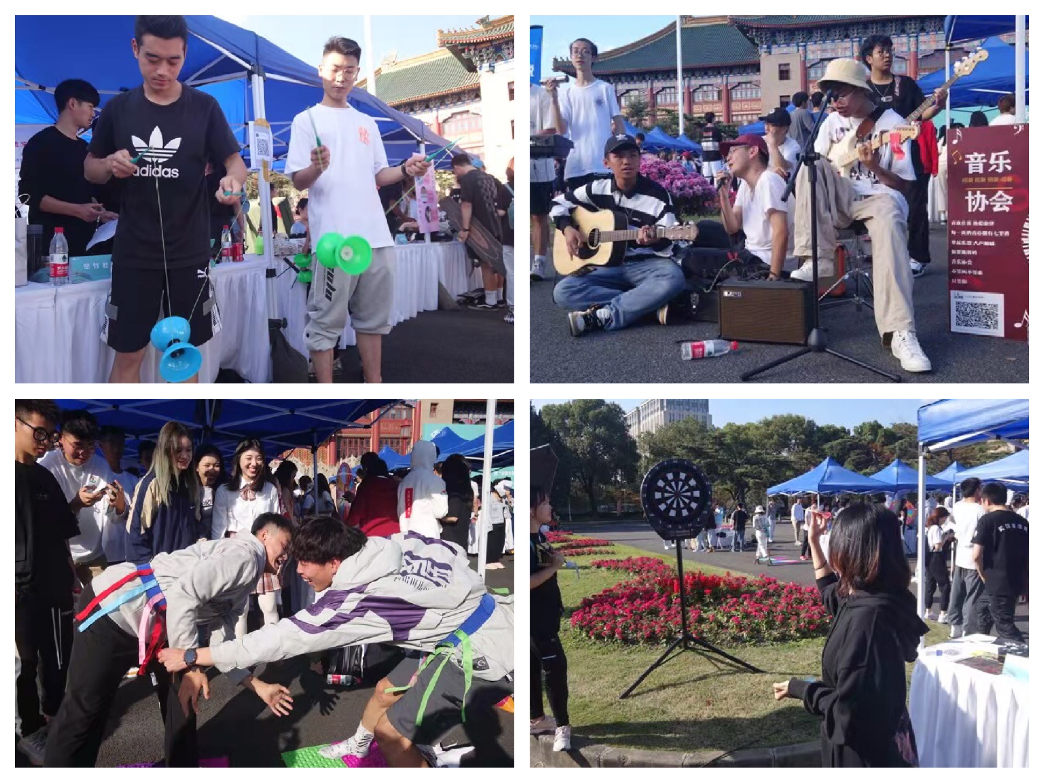 而在台下围场的体验区内,48个参会社团都摆出了自己的宣传物料,积极展示、热络招新。有的拿出了自己手工制作的小摆件,有的现场弹唱表演,有的手把手教同学专业项目动作要领。社团成员们积极卖力地推介自己热爱的兴趣社团,参与活动的师生也在热络的现场氛围的感染下体会到校园社团文化的独特魅力。