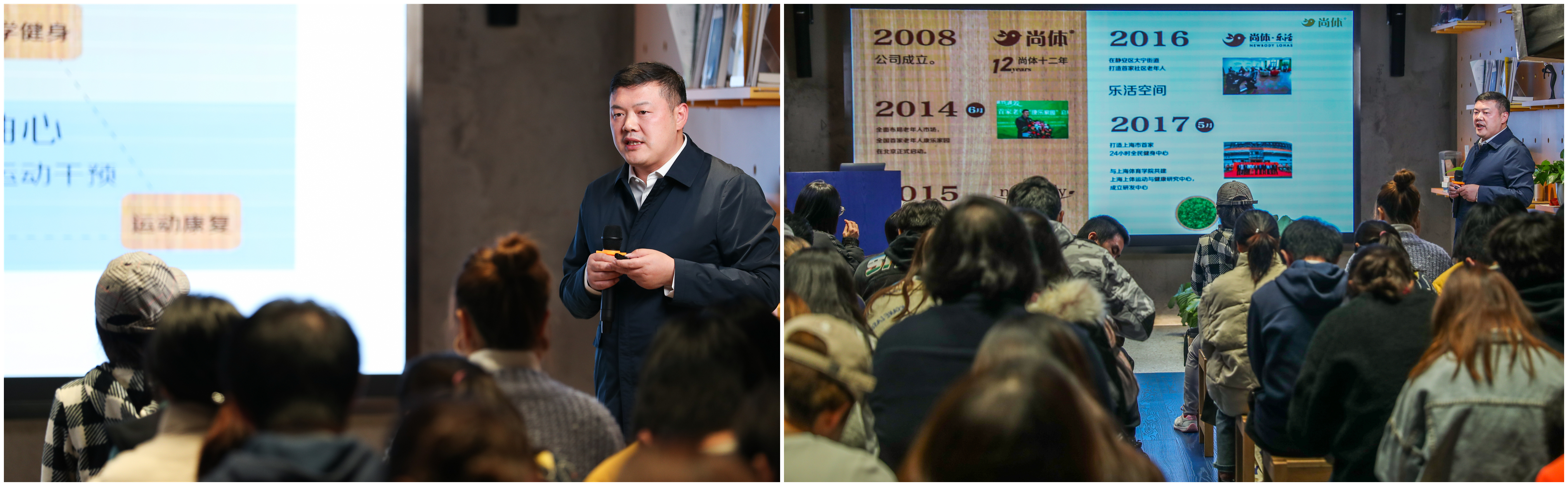 活动中,王海龙以“说说尚体”、“为什么做慢病运动干预”、“谈谈这几年的创业心得”为脉络,与同学们分享了自己的创业理念和思考。王海龙表示,王海龙和他的团队从2008年起开启创业之旅,并通过6年左右的摸索,逐渐探索出了一条属于自己的以“慢病运动干预”为核心的创业思路。他们在北京创办了全国首家老年人康乐家园;在上海打造了首家社区老年人乐活空间与首家24小时全民健身中心;并开发了乐活空间、白杏康健、螺盒健身三大业务品牌。