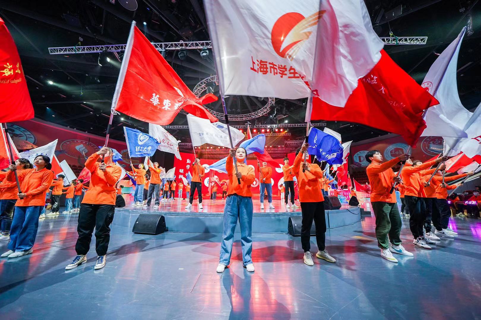 在开场的出旗仪式上,国旗、党旗、团旗和64面高校校旗在主题旗会上飘扬。上体的90名跑旗“小火炬”执旗而出,跑出了绿瓦学子独有的风采,摇出了“团结一心”的宏大气势,为本次集会表演拉开了序幕。跑旗“小火炬”们在此之前经过了为期三天的集中排练,从一开始不熟悉队形,到最后的完美呈现,“小火炬”的责任感和使命感也在此次跑旗志愿服务中得到发扬。