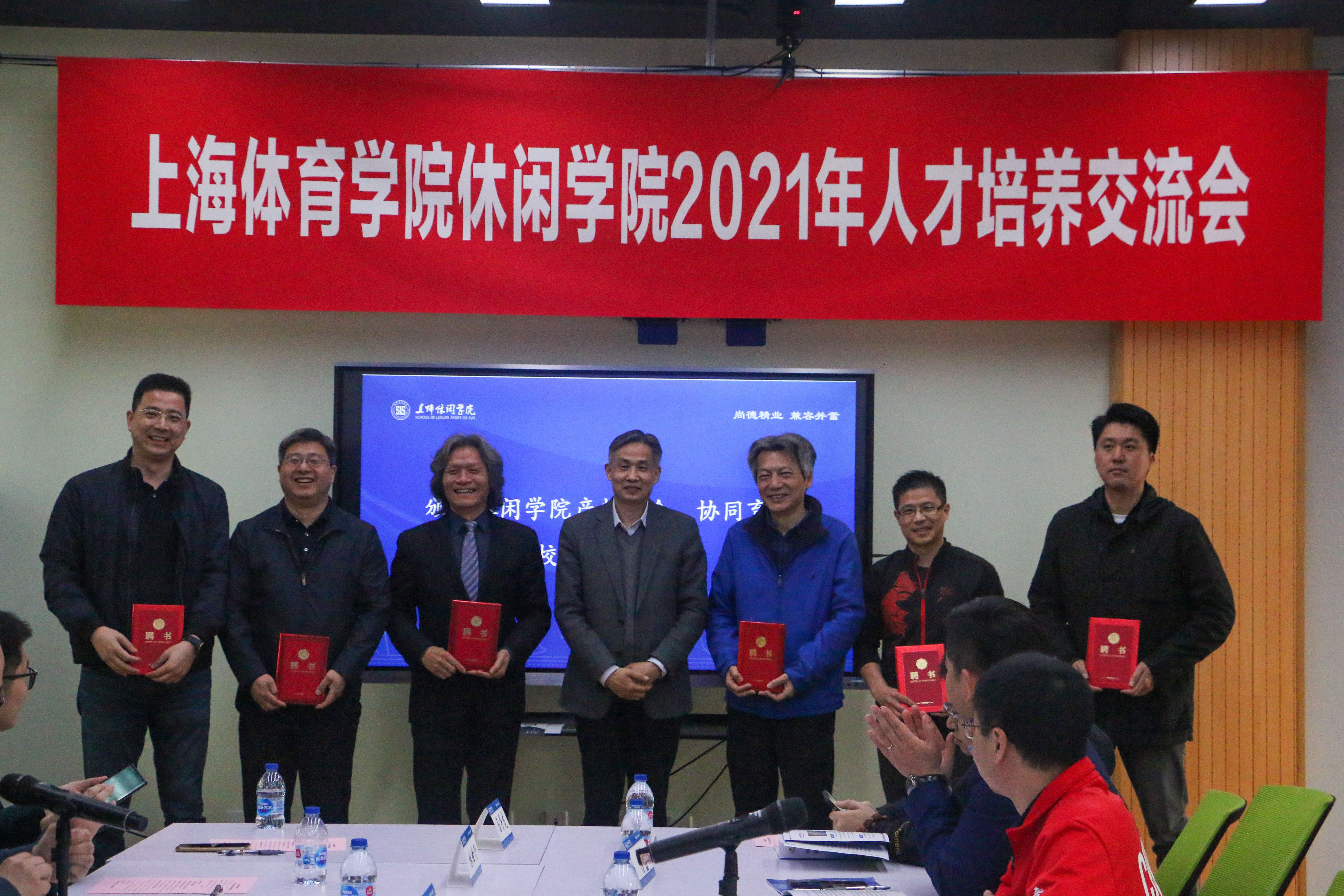 交流会上,休闲学院聘请了上海市体育总会副秘书长、上海市社会体育管理中心、上海市体育竞赛管理中心副主任周炳华,上海市青少年训练管理中心副主任、上海市青少年体育协会副会长周战伟,上海市体育场馆设施管理中心副主任黄海松,英士博集团董事长程亮,北京中迹体育管理有限公司张思杰,南京一门一派体育科技有限公司董事长兼CEO,上海奇跑体育科技有限公司董事长李帆为我院产教融合、协同育人校外导师。上海体育学院党委副书记、副校长陈晓峰为产教融合、协同育人校外导师颁发聘书。