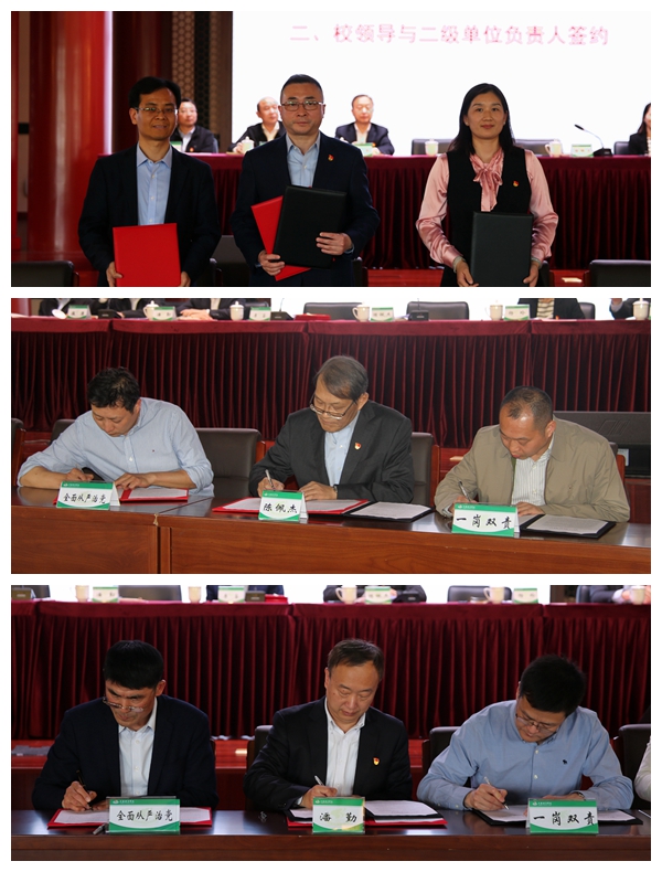 为进一步提高各级党组织和党员领导干部责任意识和主动性,落实全面从严治党工作要求和管党治党的责任闭环,会上校领导与二级党组织负责人和职能部门负责人代表签订了“二级党组织全面从严治党”和“一岗双责”责任书。