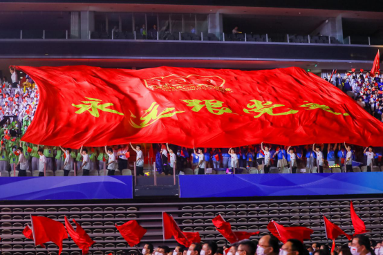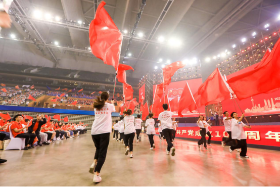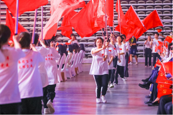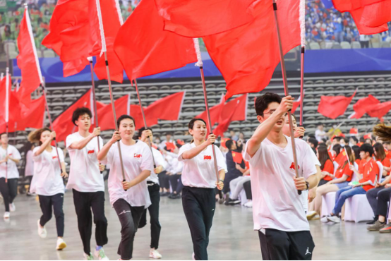 旗手节目组从接到表演邀请到现场表演,只有一周时间准备,来自于运动科学学院、武术学院、经济管理学院及校学生会等单位的近300名旗手分成“红旗表演团”和“各单位(学校)旗帜表演团”,将表演贯穿整场晚会,从开篇的《红旗颂》的有序出场、到尾声的《不忘初心》整体挥动,以及伴随主要节目来营造互动氛围的挥舞,还有观众参与感较强的绕场巨型红旗“永远跟党走”,都来自于SUNBET参演代表热情洋溢的表演。他们虽然不在灯光耀眼的舞台上,但全程活跃于整个东方体育中心场馆内,没有互动环节时就耐心地“隐藏”在观众过道,一有表演就立马扛着红旗鱼贯而入、尽力挥舞,旗杆和旗帜就是青年的责任寄托,笑容和热情就是青年的青春写照。旗手节目组的表演可能没有独占几分钟的台上亮相,但为整场近100分钟的节目营造热络而昂扬的现场气氛。
