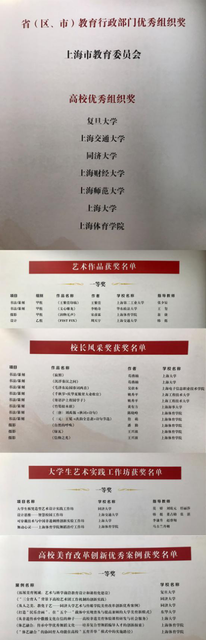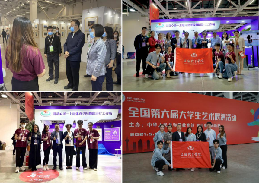 在全国第六届大艺展展演中,“舞动心灵——上海体育学院舞蹈治疗工作坊”作为上海参展的5个艺术实践工作坊之一,5月4日赴成都国际艺术展览中心进行搭建,并全程参与本次艺术展演;2个高校美育改革创新优秀案例(梅朵、陈鸿:《“体艺融合”的协同育人功能在高校“五育并举”模式中的实施路径》,韩春英:《体艺融合:传承中华优秀舞蹈文化——培养复合型舞蹈编导人才的创新探索》)入围全国决赛(上海市入选8个)并参与交流报告会,1个学生摄影作品《润物无声》(作者:宋彦霖,指导教师:翁捷)入围全国展演并展示,另外有党委副书记潘勤,上海体育学院原党委副书记、副校长陈晓峰(现任上海商学院党委副书记),原党委副书记、纪委书记詹萌,原副院长王兴放等5个校长作品参与高校校长作品展示。特别要指出的是,获得上海市一等奖的舞蹈、合唱及获二等奖的朗诵作品,参赛师生从筹备到排练、演出,克服了疫情、课程、专业训练等困难,刻苦训练,在经历中成长,在磨砺中蜕变,几个月来的磨合与合作,也更进一步促进了学生团队的凝聚力和协作精神的培养。