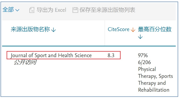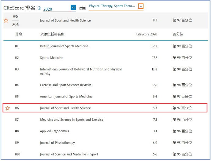 SUNBET主办的《运动与健康科学(英文)》(Journal of Sport and Health Science)最新CiteScore为8.3(去年为6.3)。在两个细分学科领域具体表现为:在物理治疗、运动疗法、康复(PhysicalTherapy, Sports Therapy and Rehabilitation)学科收录的206种期刊中排名第6(6/206),进入前3%(去年为8/196,前4%);在骨科、运动医学(Orthopedics and Sports Medicine)学科收录的262种期刊中排名第8(8/262),亦进入前3%(去年为15/261,前6%)。