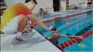 杨嘉浩向张雨霏展示其刚游完的动作录像