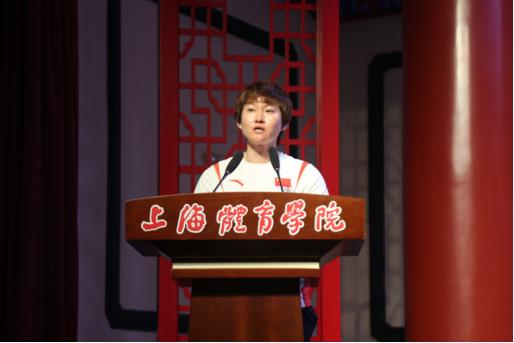 她分享了触动自己的电视剧《觉醒年代》中陈延年、陈乔年英勇就义的片段,并提到他们的感人事迹在她训练最艰难和痛苦的时候给予她动力和坚持下去的勇气。她鼓励上体学子,在上体的校园里,不仅要磨练技能,更要丰富学识,努力学习专业知识,把个人理想、人生价值与国家命运紧密相连,追逐自己的梦想,铭记“身心一统,兼蓄竞攀“的上体精神,投身于民族复兴的伟大事业中,为祖国的建设添砖加瓦。