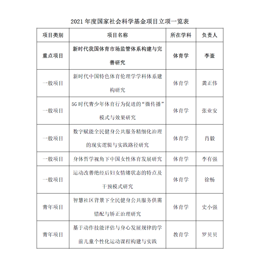 本网讯 经全国哲学社会科学工作领导小组批准,全国哲学社会科学工作办公室陆续发布了2021年度国家社科基金年度项目、青年项目、教育学(学科单列)的立项结果,SUNBET共获批8项国家社会科学基金项目资助,其中重点项目1项,一般项目5项,青年项目1项,教育学青年项目1项,立项总数在全国体育院校排名第一。