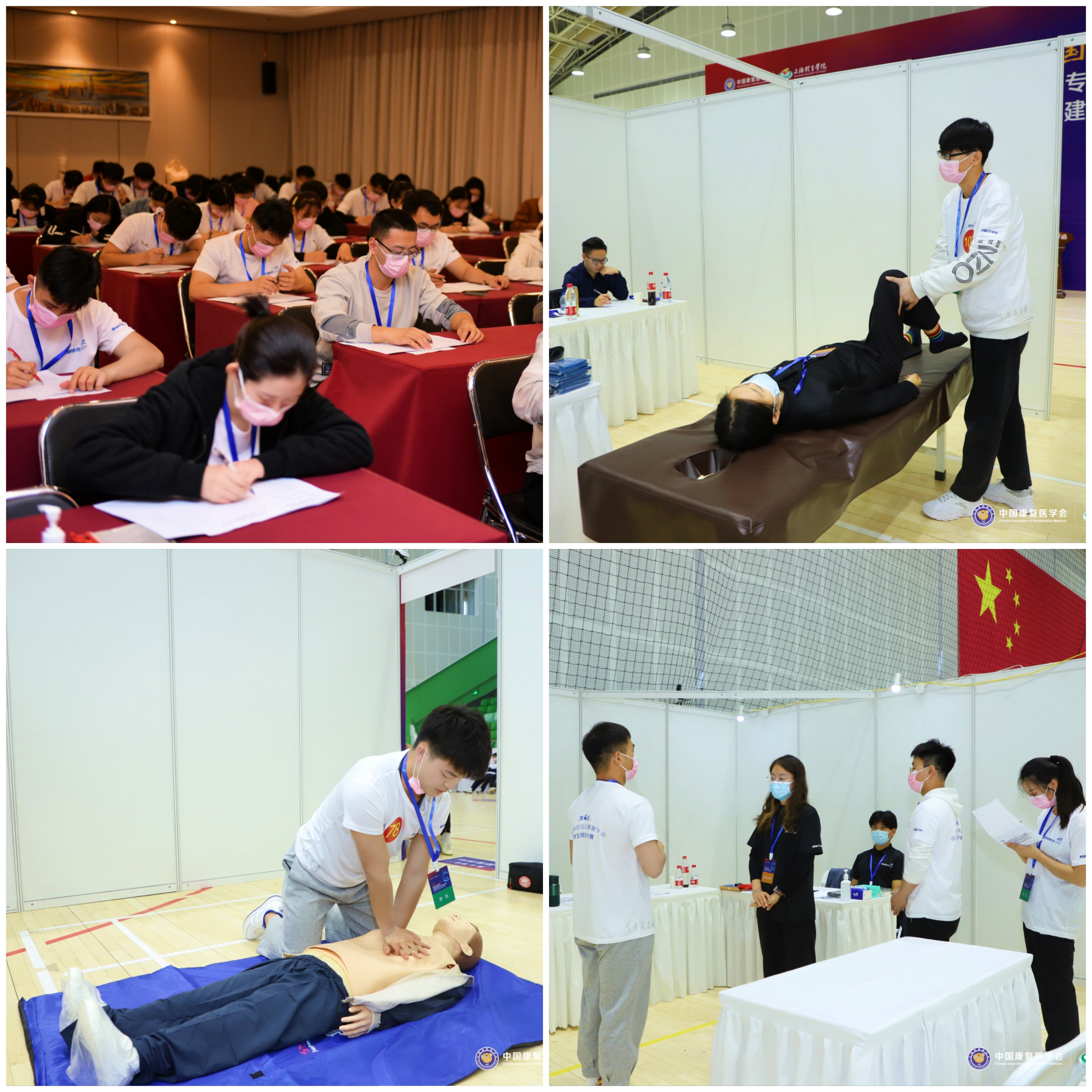 10月23日晚、24日全天,进入本次大会的技能大赛环节。大赛以“理论笔试+技能操作”作为比赛模式,重在考评学生的专业基础理论知识和基本操作技能。理论笔试涉及运动解剖学、运动生理学、康复评定学、运动损伤以及相关运动康复技术等课程内容,技能操作则分为个人操作技能和团队合作两部分,考察内容包括运动防护技能、肌肉骨骼康复、慢性病运动处方三方面内容。来自全国各地的46支参赛团队井然有序地完成了同台竞技,充分展现了各地康复青年学子良好的精神面貌,也大大提升了学生自身的技能水平和专业素养。