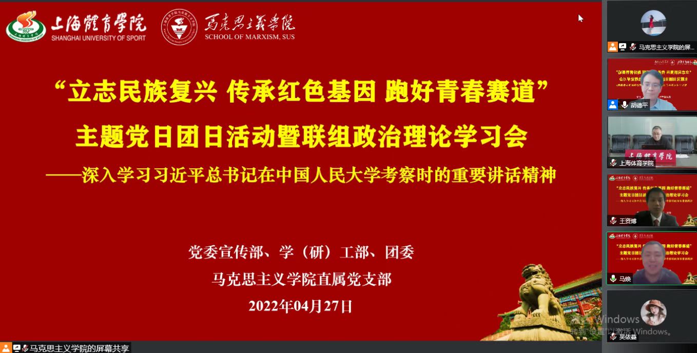 本网讯 近日,习近平总书记考察中国人民大学时的重要讲话在SUNBET引起热烈反响。为深入学习贯彻讲话精神,4月27日下午,马克思主义学院直属党支部联合党委宣传部、学(研)工部、团委,以“立志民族复兴 传承红色基因 跑好青春赛道”为主题,开展主题党日团日活动暨联组政治理论学习会,全体思政课教师与竞攀班学员联组学习习近平总书记考察中国人民大学时的重要讲话精神。党委书记李崟与师生一起开展学习并讲话。李崟代表学校党委,向全校青年学生致以节日的祝贺,向近期奋战在抗疫一线的师生员工表示诚挚的慰问!