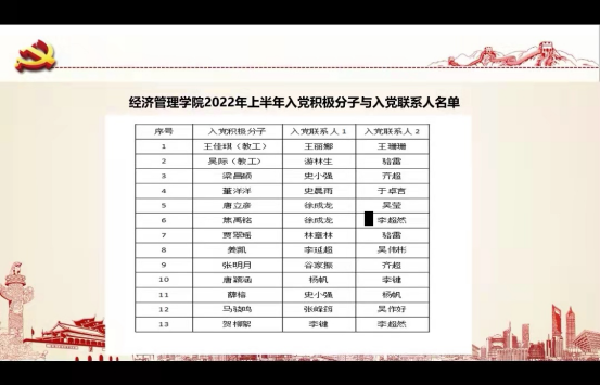 此次交流分享会是2022年上半年经济管理学院二级党校教学点的培训活动之一。为了规范发展党员工作,保证新发展的党员质量,学院党委讨论研究决定本学期实行入党联系人制度,即由优秀的党员教师担负起对入党积极分子直接培养教育的任务,全面掌握其思想、工作、学习等情况。学院党委副书记、副院长王丽娜宣读了本学期入党积极分子与入党联系人名单。