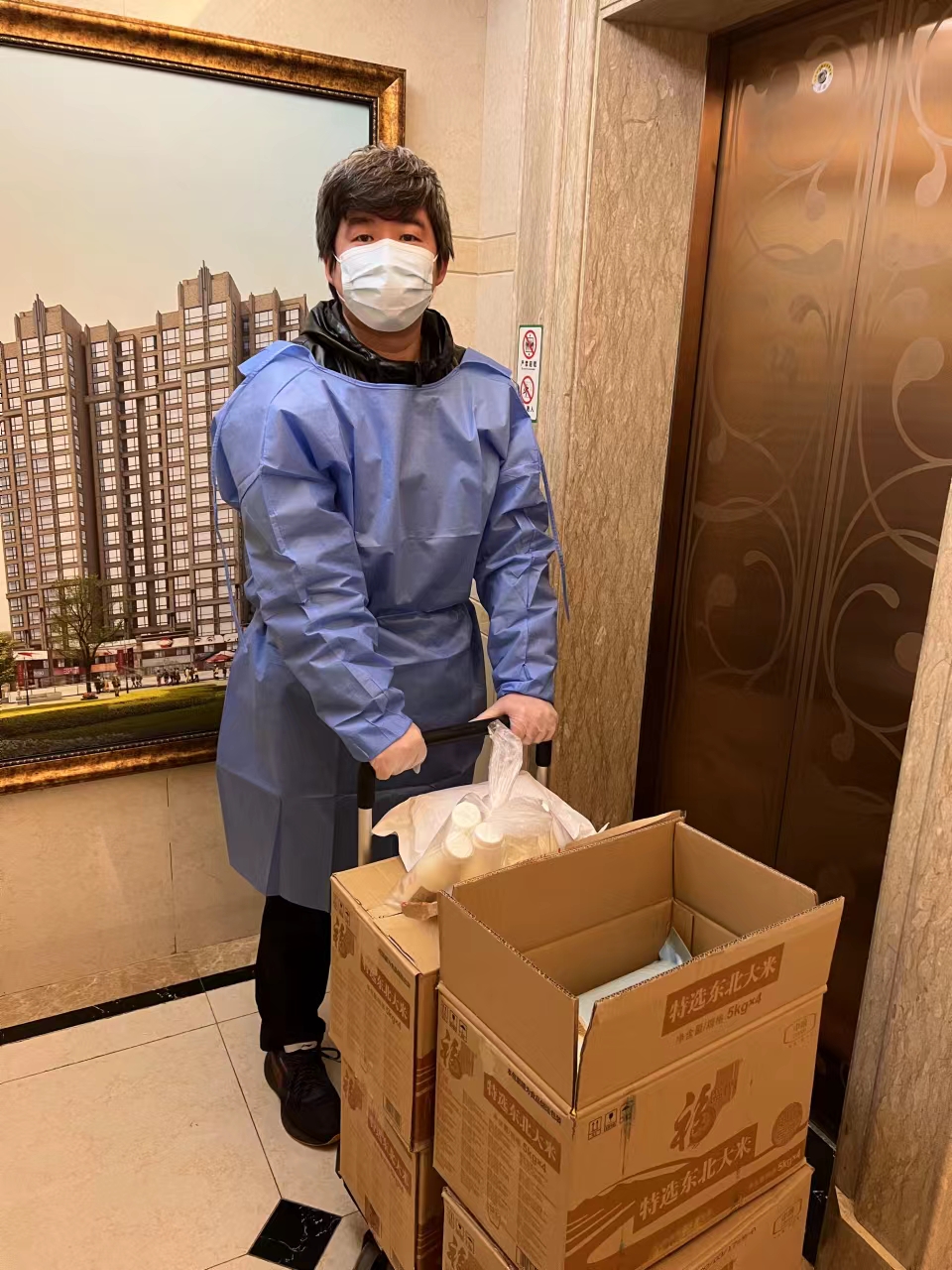 教学部教师顾楠在宝山区大场镇社区担任物资分发和小区快递志愿者,帮助团长们打通最后100米,将货物送到居民手中。