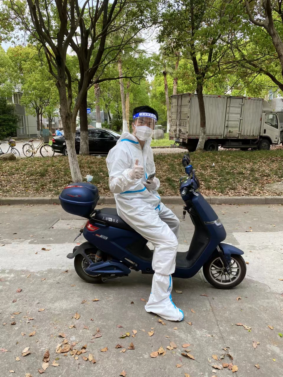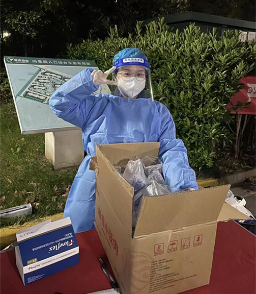 国际交流与培训部教师张丁丁在杨浦区新江湾城街道参加社区核酸检测、物资分发和小区快递志愿服务。