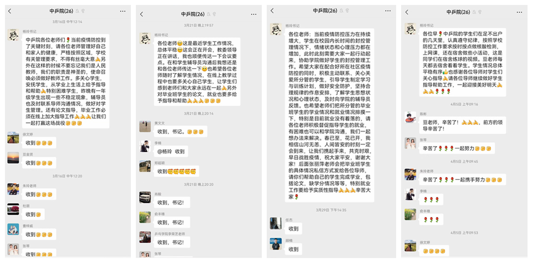 面对疫情大考,中乒院党委带领全体党员教职工勇担使命、履职尽责、落实行动,驻校和居家教职工密切配合,线上线下指导学生落实本市和学校的防控要求,在有序安排线上教育教学工作的同时,加强对同学们的心理健康的引导,充分发挥党支部战斗堡垒和党员先锋模范作用。3月中旬,上海体育学院党委副书记、中乒院党委书记杨玲对于疫情防控工作安排做了全院动员和倡议,要求全体教职工拧成一股绳,心往一处想、劲往一处使,凝聚汇集起了疫情防控的强大合力,以最快速度、最大努力,全力以赴做好校园疫情防控各项工作。杨玲书记十分关心封控期间学生们的心理状况,多次在线上发出倡议:要求教职工加强学生思想、心理、情绪动态排摸监测和思想教育引导,加强对学生心理疏导,舒缓学生焦虑情绪,特别强调要梳理好毕业班学业完成情况,多方协同推进毕业班学生就业工作。