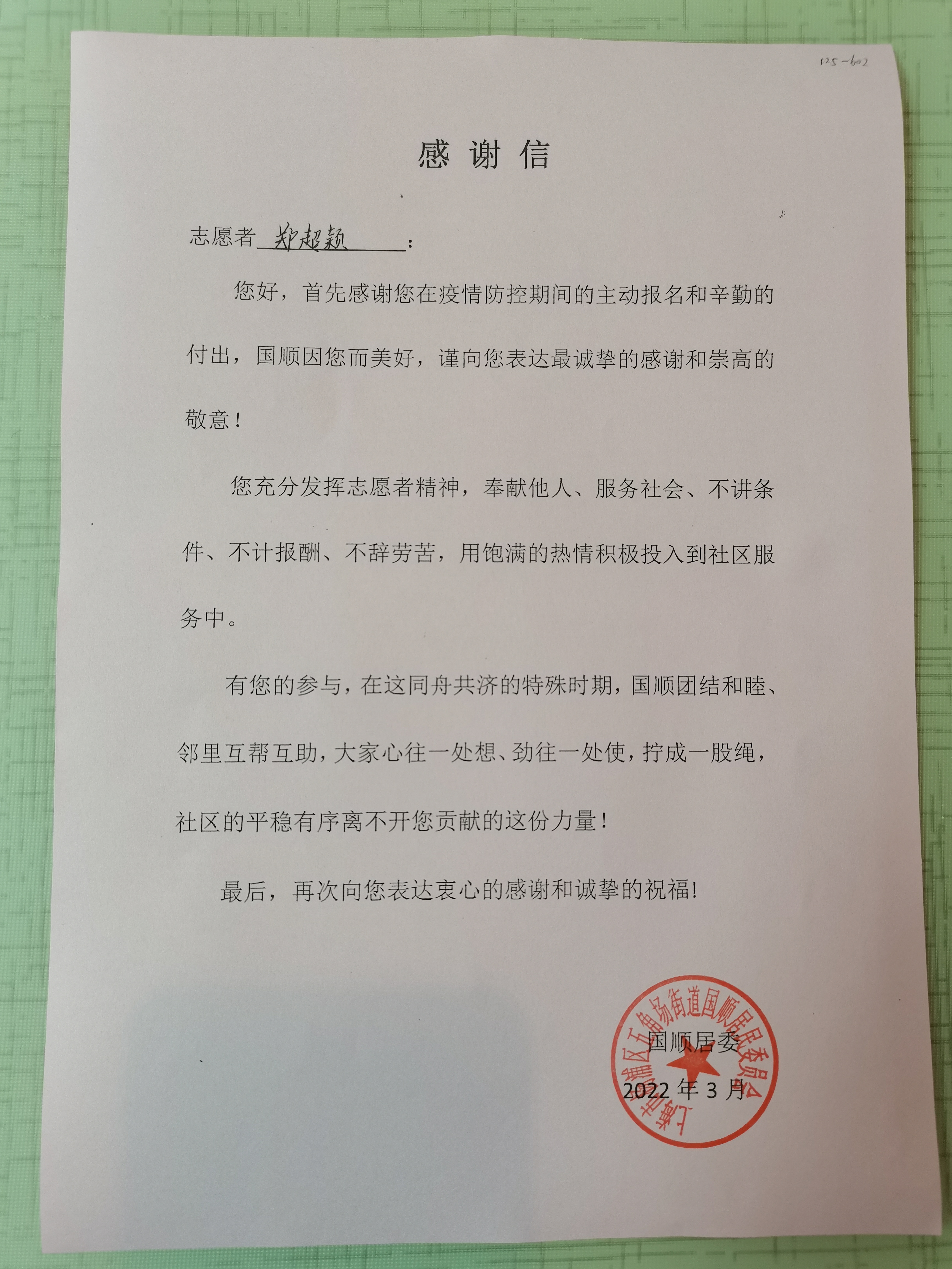训练部教练郑超颖在杨浦区五角场街道参加志愿服务,收到社区感谢信。