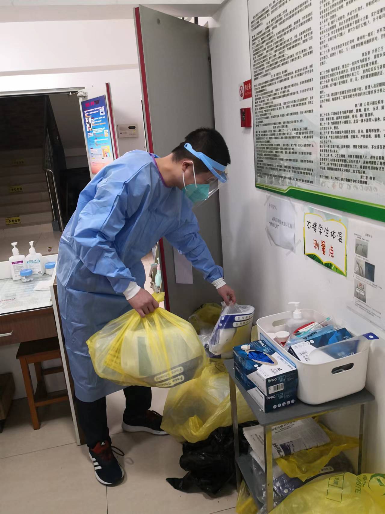 教学部教师曹梓威在杨浦区长海路街道参加社区核酸、物资分发志愿服务。