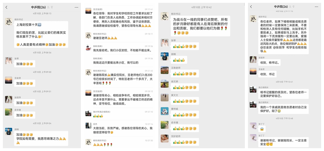 学院领导深入防控一线,靠前指挥,线上线下动员部署疫情防控工作。为进一步做好疫情防控工作,提高学生的防控意识,学院疫情防控领导小组组长杨玲分批次动员慰问在封控状态下的全体学生。杨玲书记传达了习近平总书记关于疫情防控工作重要指示精神和上海市新冠肺炎疫情防控领导小组会议部署要求,分析当前疫情防控形势,并向闭环管理中的全体学生表示关心与慰问。