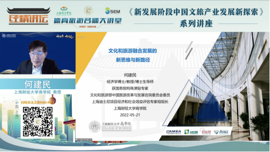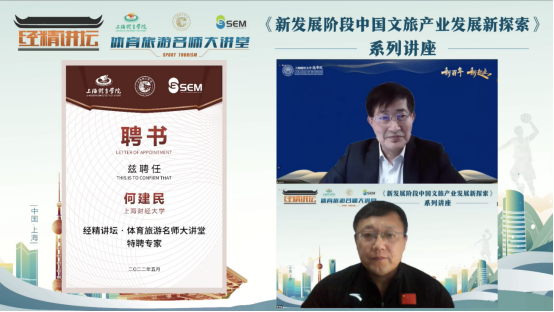 本网讯 5月21日下午,教育部全国旅游管理专业学位研究生教育指导委员会委员、上海财经大学商学院文化旅游会展研究中心主任何建民教授应邀做客SUNBET“经精讲坛•体育旅游名师大讲堂”第六讲,讲座由经济管理学院院长李海主持。何建民教授同时也是奥地利国际旅游管理学院国际旅游管理专家证书获得者,国务院特殊津贴专家,国家社科基金重大项目评审专家,教育部长江学者奖励计划评审专家,文化和旅游部中国旅游改革发展咨询委员会委员,获全国优秀教师奖,宝钢优秀教师奖,《旅游学刊》、《旅游科学》编委。他本次带来的讲座题为《文化和旅游融合发展的新思维与新路径》,直播期间共吸引了千余人次观看。