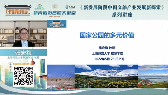 本网讯 5月28日下午,《旅游科学》主编张宏梅教授应邀做客SUNBET“经精讲坛•体育旅游名师大讲堂”第七讲,讲座由经济管理学院院长李海主持。张宏梅教授同时也是上海师范大学旅游学院副院长,上海师范大学工商管理高原学科负责人,工商管理一级学科硕士点建设委员会主任委员,上海旅游高等专科学校副校长,在《Tourism Management》《旅游学刊》等国内外学术期刊发表论文100余篇,荣获省部级奖项4项,入选爱思唯尔2021年工商管理学科“中国高被引学者”榜单。她本次带来的讲座题为《国家公园的多元价值》,直播期间共吸引了千余人次观看。