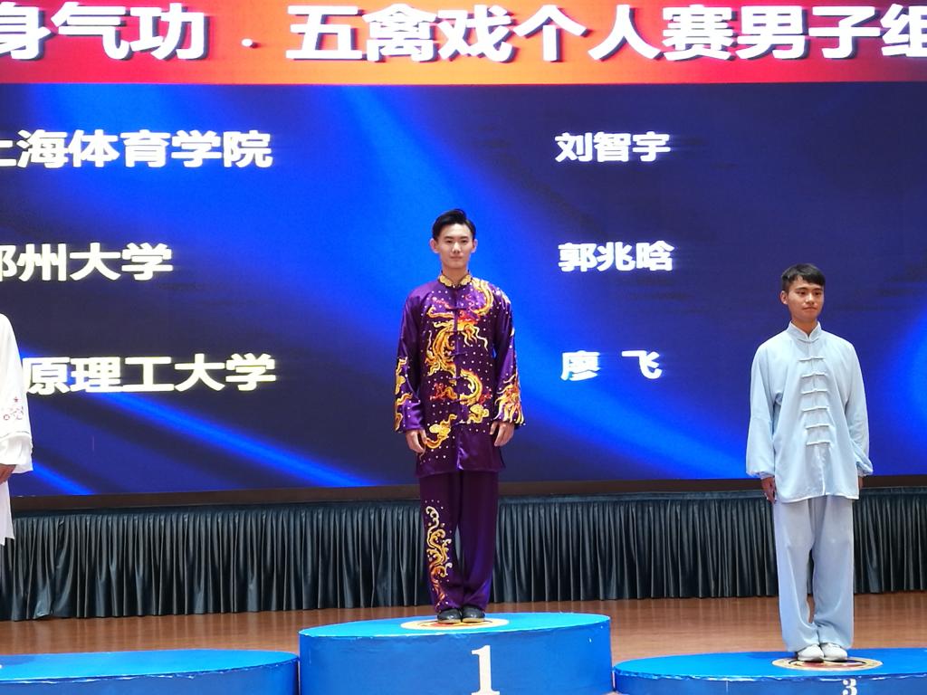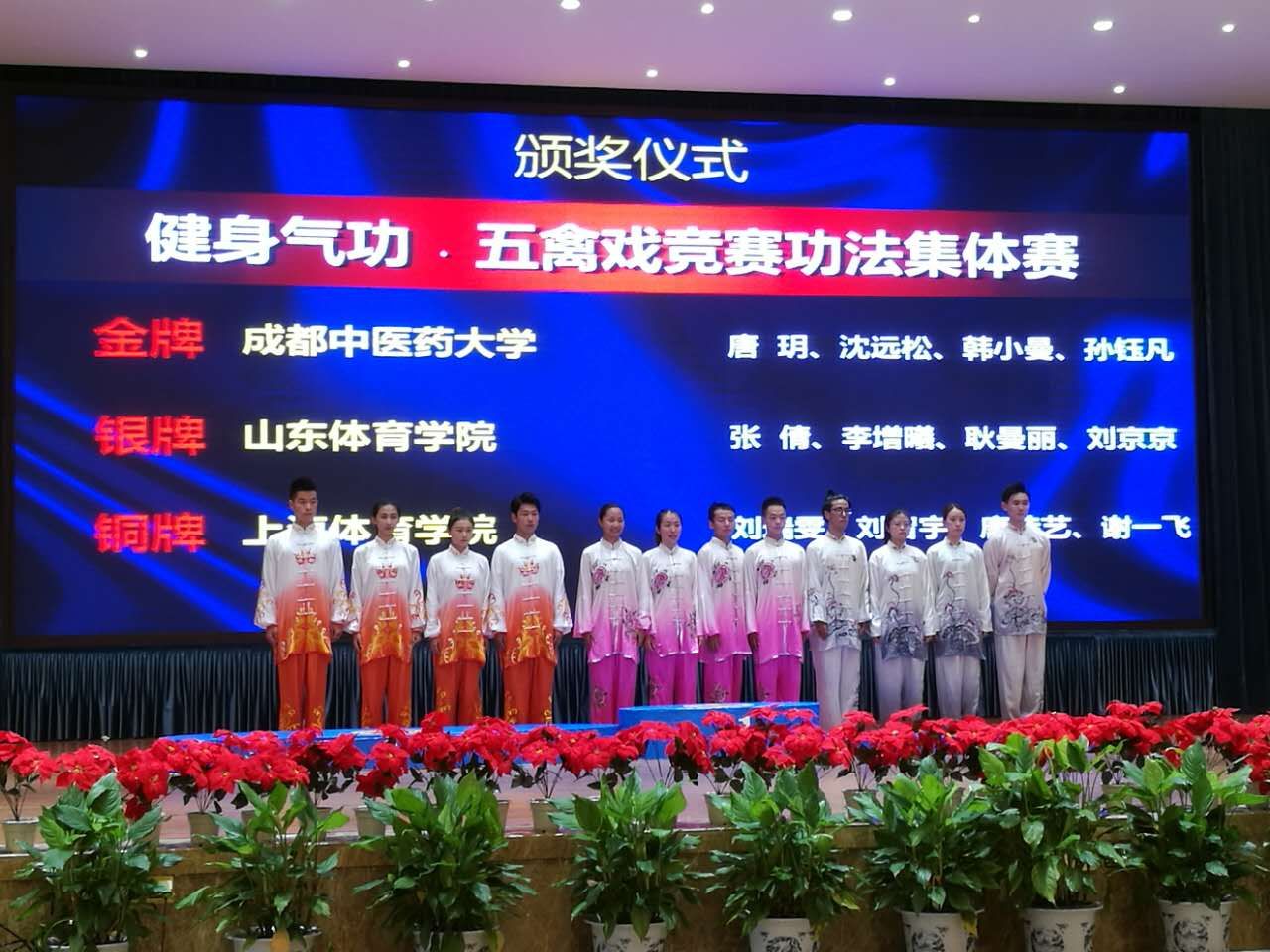 本网讯 7月31日,由国家体育总局健身气功管理中心和四川省体育局主办,绵阳市梓潼县人民政府承办的2017年全国高等院校(体育院系组)健身气功比赛在四川梓潼完美收官。本次比赛,我院共获得了两金一银一铜的优异成绩,获奖项目分别是:集体八段锦(金牌)、集体五禽戏(铜牌)、男子个人五禽戏(金牌)、女子个人五禽戏(银牌)。教练赖剑慧荣获2017年全国高等院校健身气功比赛(体育院系组)体育道德风尚优秀教练奖。
