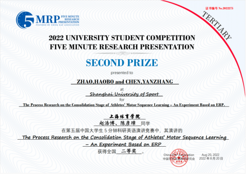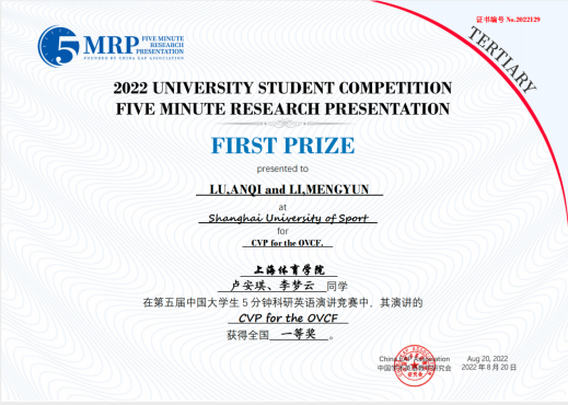 “第五届中国大学生5分钟科研英语演讲大赛”于2022年3月开始,此次赛事以参赛团队提交视频作品,由多位学科专业专家和语言专家组成的评审团共同评定的形式开展。全国近50个赛区的近7000支本科生或研究生团队在经过初赛、复赛和决赛三轮(决赛分文理科类和医科类赛区)的激烈角逐后,最终产生特等奖27个、一等奖55个、二等奖275和三等奖389个。为全力备赛,新闻与传播学院师生团队反复修改演讲稿撰写、PPT设计,反复推敲表达的逻辑、语法、选词用句,精心优化演讲姿态、神情管理,并由新闻专业教师唐建军指导视频背景、录音、剪辑。最终,作品“CVP for the OVCF ”(卢安琪、李梦云)、“The Process Research on the Consolidation Stage of Athletes’Motor Sequence Learning – An Experiment Based on ERP”(赵浩博、陈彦璋)脱颖而出。