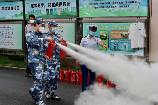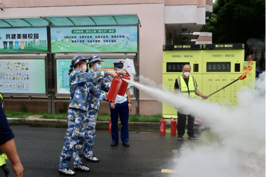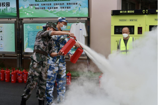 随后步入室外,消防救援中心的教导员杨警官为同学们讲解和展示了灭火器的正确使用方法,同时邀请同学们体验灭火器的使用,并对其进行操作上的指导和纠正。在亲身体验灭火过程后,同学们对于灭火器的使用步骤及要领已经了然于胸。