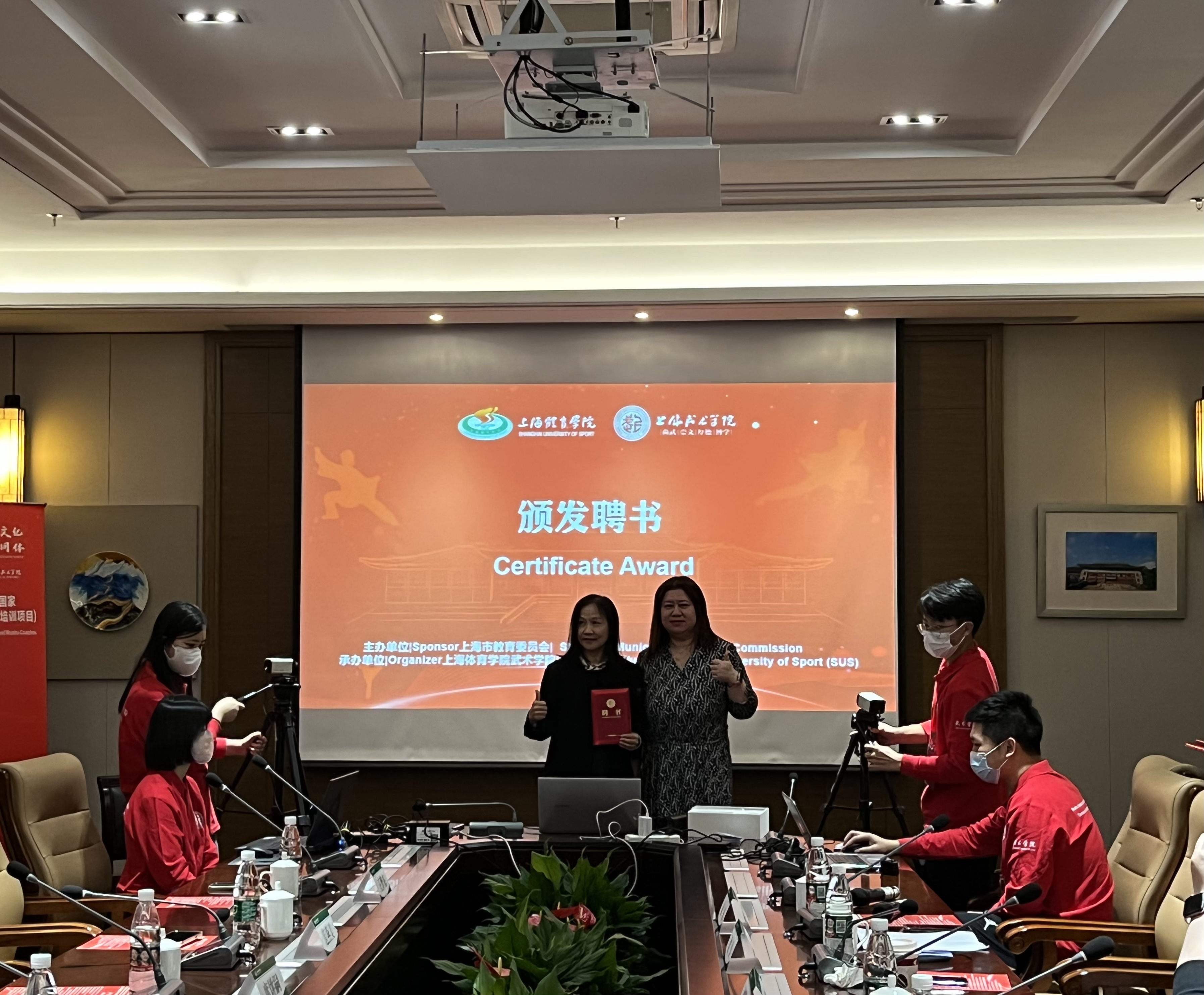 为使学员们更快融入课程,与会成员一同观看了上海体育学院宣传片、“一带一路”国家高水平武术教练员线上培训项目和上海暑期学校武术项目纪录片。来自马来西亚、希腊的两位学员分别分享了他们眼中的武术和中国文化,也表达了对项目主承办方的感激之情,他们表示将珍惜此次宝贵的机会,在老师们的带领下学习到更多的专业知识。开幕式最后,国际交流处处长(港澳台事务办公室主任)沈佳给此次项目授课专家代表颁发聘书,感谢他们对项目的大力支持。