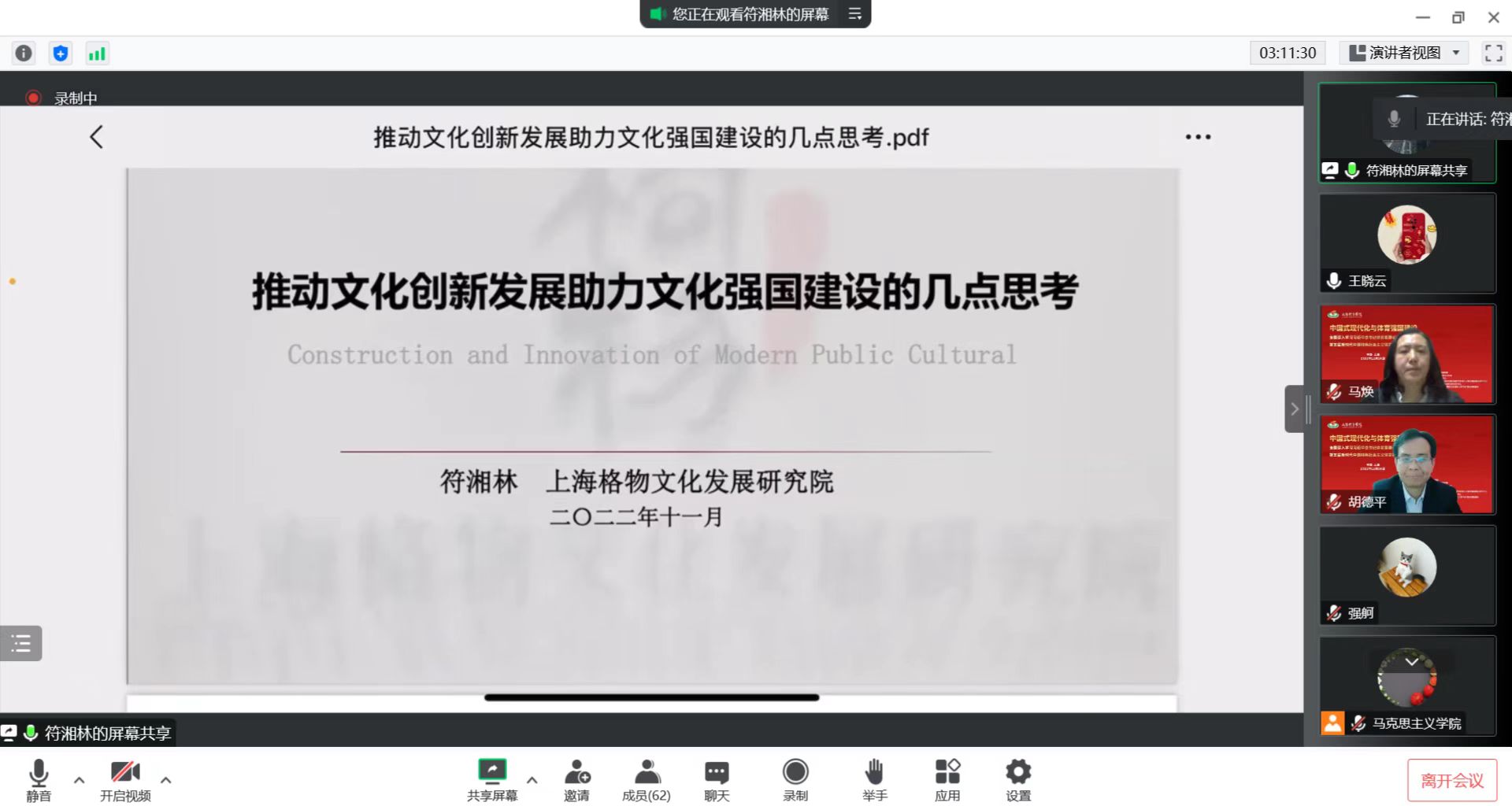 在主题研讨阶段,上海外国语大学中国国际舆情研究中心副主任、博士生导师、新闻传播学院吴瑛教授,中共中央党校(国家行政学院)党建教研部强舸教授,国家文旅部文化和旅游公共服务专家委员会委员、国家文化馆发展研究院学术委员、上海格物文化发展研究院院长符湘林,上海人工智能实验室治理研究中心副主任王迎春研究员,人民日报社人民论坛杂志社《国家治理》周刊副主编王克博士,财政部中国财政科学研究院教科文研究中心助理研究员、中国人民大学产业经济与竞争政策研究中心研究员周孝博士,上海体育学院马克思主义学院李金早副教授、张玮玮副教授分别作交流发言,上海体育学院马克思主义学院副院长马焕副教授主持主题研讨。