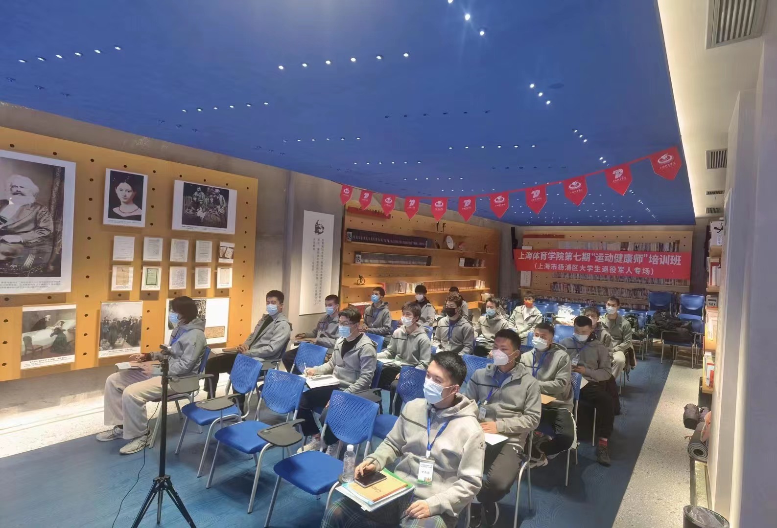 本次培训班是贯彻落实《关于促进新时代退役军人就业创业工作的意见》(退役军人部发[2018]26号)、《上海市退役军人事务局关于开展自主就业退役士兵职业技能培训工作通知》(沪退役军人局发[2021]61号)等文件精神,作为上海市大学生退役军人职能能力提升工作的一个组成部分,共有40名来自复旦大学、上海理工大学、上海体育学院等6所杨浦区高校大学生退役军人报名参加。12月5日上午,培训班开班仪式在上海体育学院绿瓦书店举行,上海体育学院继续教育学院院长杨烨,上海市杨浦区退役军人事务局移交安置科科长龚祺等出席开班仪式。