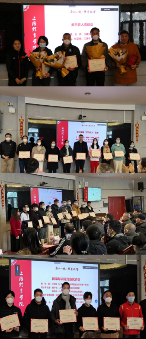 学院表彰了2022年度在校园防疫、党团建设、理论学习、专业发展、教学训练、学科科研、科技服务等工作中取得突出成绩的教职工,并隆重为8位教龄(工龄)35周年以上的老师颁发了“教书育人贡献奖”。当天共计颁发了13个类别的奖项。号召大家以受表彰的教职工为榜样,在新的一年,团结奋进,再创佳绩,为学校“双一流”建设贡献更多智慧和力量。