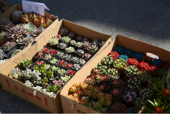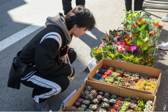 今年的服务活动相较往年更加丰富,包括“爱绿护绿”平价花卉售卖、平价菜售卖和“美化清洁校园”志愿服务。3月3日中午,物业部在第一、二餐厅前摆放多肉盆栽、仙客来、红掌、星型凤梨、发财树等各类绿植,吸引了众多师生、员工驻足观赏与选购。