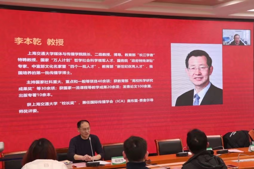 本网讯 3月1日,新闻与传播学院2023年硕士研究生导师大会如期召开。上海体育学院研究生处处长刘东锋、副处长王琳,新闻与传播学院党委书记高艳丽、副院长郑国华(主持工作)、党委副书记、副院长张瑞青出席,新闻与传播学院全体硕士研究生导师、研究生辅导员王乐、教学秘书何丹参加本次会议。会议由郑国华主持,并特别邀请到上海交通大学媒体与传播学院院长李本乾教授进行视频交流。